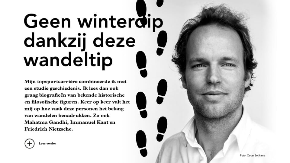 Mijn topsportcarrière combineerde ik met een studie geschiedenis. Ik lees dan ook graag biografieën van bekende historische en filosofische figuren. Keer op keer valt het mij op hoe vaak deze personen het belang van wandelen benadrukken. Zo ook Mahatma Gandhi, Immanuel Kant en Friedrich Nietzsche.