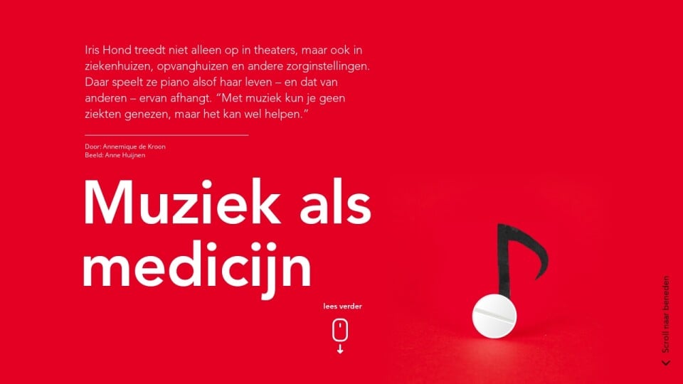 Het gesprek vindt plaats in de lounge van Hotel Des Indes in Den Haag. De sfeer is rustig en voornaam en lijkt passend voor een klassiek geschoolde pianiste. Maar Iris Hond is geen doorsneemusicus. Ze leefde als tiener een paar maanden op straat, luistert graag naar progressieve rock en treedt niet alleen op in concertzalen maar ook in ziekenhuizen, verslavingsklinieken en verzorgingstehuizen.