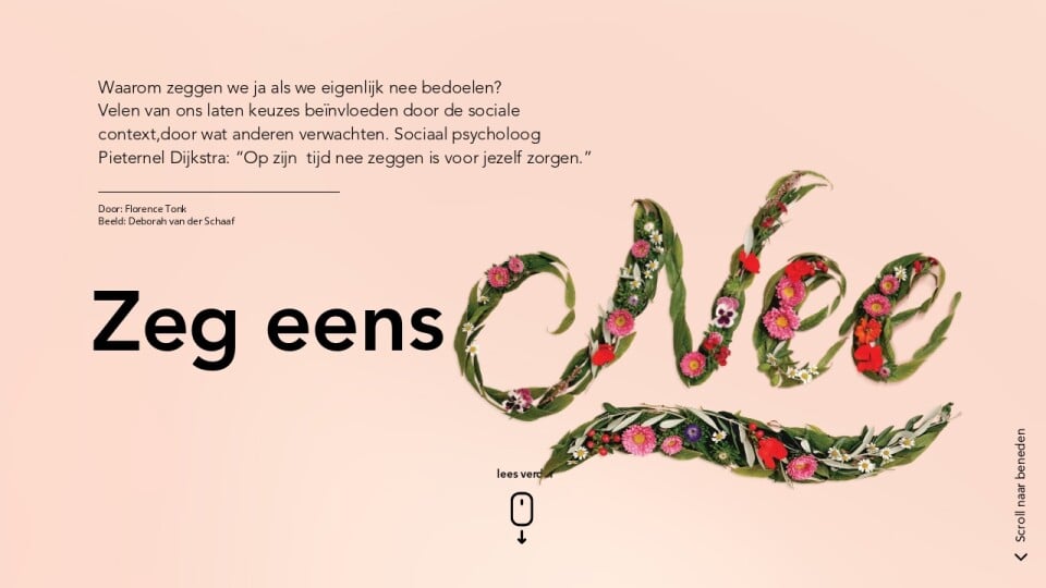 “Laat ik vooropstellen dat het goed is om rekening te houden met anderen. Zeker als ze dicht bij je staan, zoals vrienden en familieleden. Toch is het ook belangrijk om je eigen grenzen te bewaken. Anders laat je je leven bepalen door de behoeften, wensen en verwachtingen van anderen. Als je nooit nee durft te zeggen, kun je jezelf voorbijlopen, je eigen behoeften negeren. Af en toe nee zeggen creëert meer ruimte voor jezelf: wat wil ik, wat kan ik aan? Op z’n tijd nee zeggen is voor jezelf zorgen.”